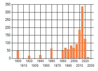 Het aantal atlasblokken (5x5 km) waarin de soort is gemeld binnen een periode van vijf jaar (vanaf 1980) of twintig jaar. Niet gecorrigeerd voor waarnemersinspanning en het aantal doorgegeven waarnemingen kan sterk variëren per periode, dus een trend in verspreiding kan hier niet direct uit worden afgelezen. Het opgegeven jaartal is het eerste jaar van de periode. Bron: gevalideerde waarnemingen uit de NDFF.