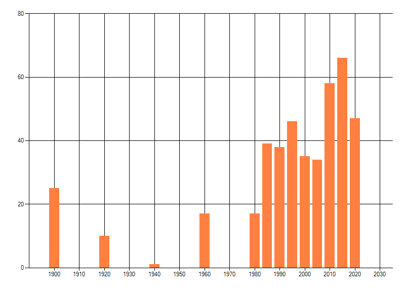 Het aantal atlasblokken (5x5 km) waarin de soort is gemeld binnen een periode van vijf jaar (vanaf 1980) of twintig jaar. Niet gecorrigeerd voor waarnemersinspanning en het aantal doorgegeven waarnemingen kan sterk variëren per periode, dus een trend in verspreiding kan hier niet direct uit worden afgelezen. Het opgegeven jaartal is het eerste jaar van de periode. Bron: gevalideerde waarnemingen uit de NDFF.