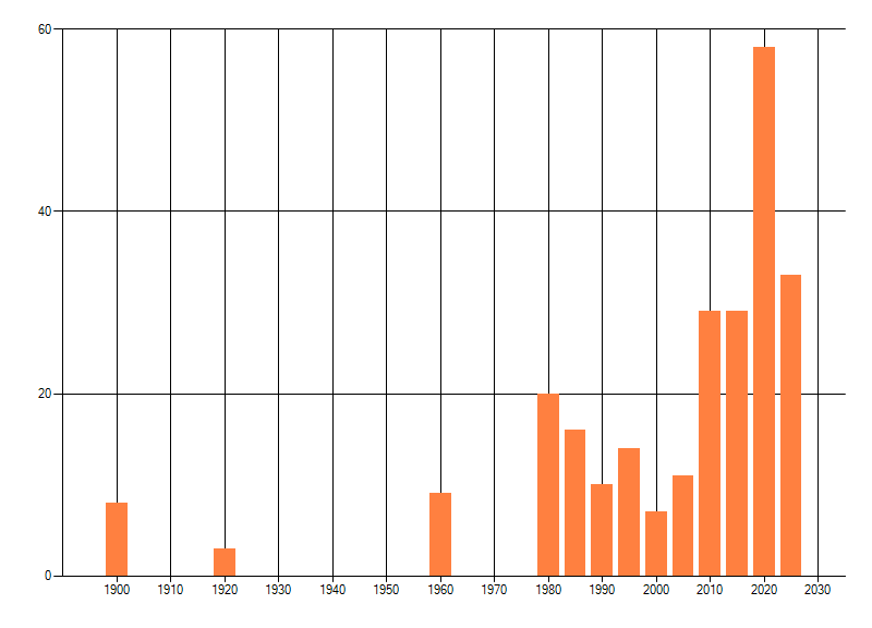 Het aantal atlasblokken (5x5 km) waarin de soort is gemeld binnen een periode van vijf jaar (vanaf 1980) of twintig jaar. Niet gecorrigeerd voor waarnemersinspanning en het aantal doorgegeven waarnemingen kan sterk variëren per periode, dus een trend in verspreiding kan hier niet direct uit worden afgelezen. Het opgegeven jaartal is het eerste jaar van de periode. Bron: gevalideerde waarnemingen uit de NDFF.