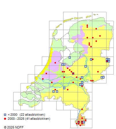 Het aantal atlasblokken (5x5 km) waarin de soort is gemeld binnen een periode van vijf jaar (vanaf 1980) of twintig jaar. Niet gecorrigeerd voor waarnemersinspanning en het aantal doorgegeven waarnemingen kan sterk variëren per periode, dus een trend in verspreiding kan hier niet direct uit worden afgelezen. Het opgegeven jaartal is het eerste jaar van de periode. Bron: gevalideerde waarnemingen uit de NDFF.