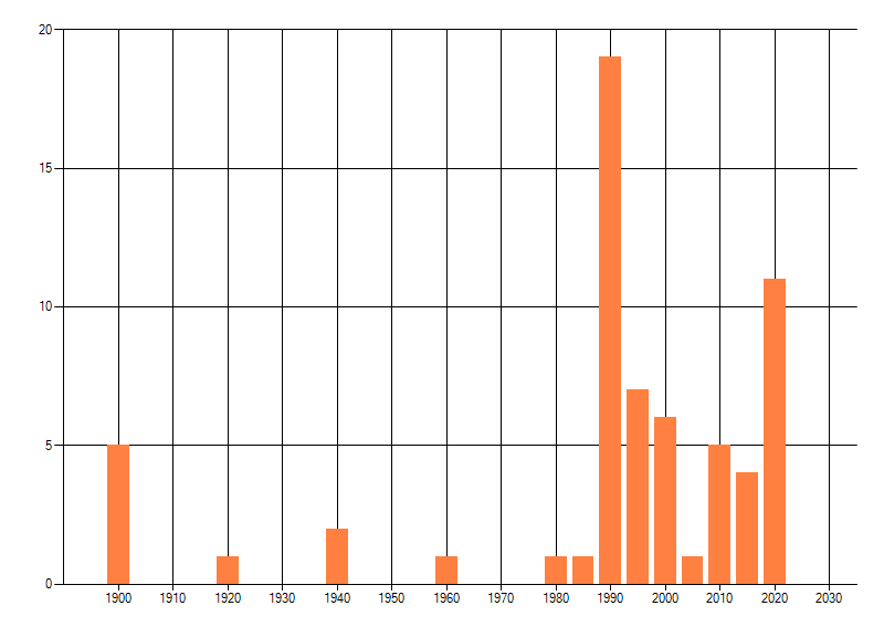 Het aantal atlasblokken (5x5 km) waarin de soort is gemeld binnen een periode van vijf jaar (vanaf 1980) of twintig jaar. Niet gecorrigeerd voor waarnemersinspanning en het aantal doorgegeven waarnemingen kan sterk variëren per periode, dus een trend in verspreiding kan hier niet direct uit worden afgelezen. Het opgegeven jaartal is het eerste jaar van de periode. Bron: gevalideerde waarnemingen uit de NDFF.