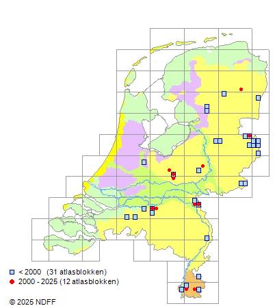 Het aantal atlasblokken (5x5 km) waarin de soort is gemeld binnen een periode van vijf jaar (vanaf 1980) of twintig jaar. Niet gecorrigeerd voor waarnemersinspanning en het aantal doorgegeven waarnemingen kan sterk variëren per periode, dus een trend in verspreiding kan hier niet direct uit worden afgelezen. Het opgegeven jaartal is het eerste jaar van de periode. Bron: gevalideerde waarnemingen uit de NDFF.