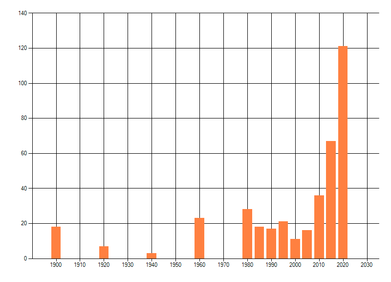 Het aantal atlasblokken (5x5 km) waarin de soort is gemeld binnen een periode van vijf jaar (vanaf 1980) of twintig jaar. Niet gecorrigeerd voor waarnemersinspanning en het aantal doorgegeven waarnemingen kan sterk variëren per periode, dus een trend in verspreiding kan hier niet direct uit worden afgelezen. Het opgegeven jaartal is het eerste jaar van de periode. Bron: gevalideerde waarnemingen uit de NDFF.
