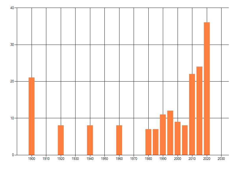Het aantal atlasblokken (5x5 km) waarin de soort is gemeld binnen een periode van vijf jaar (vanaf 1980) of twintig jaar. Niet gecorrigeerd voor waarnemersinspanning en het aantal doorgegeven waarnemingen kan sterk variëren per periode, dus een trend in verspreiding kan hier niet direct uit worden afgelezen. Het opgegeven jaartal is het eerste jaar van de periode. Bron: gevalideerde waarnemingen uit de NDFF.