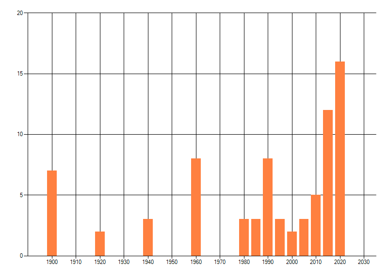 Het aantal atlasblokken (5x5 km) waarin de soort is gemeld binnen een periode van vijf jaar (vanaf 1980) of twintig jaar. Niet gecorrigeerd voor waarnemersinspanning en het aantal doorgegeven waarnemingen kan sterk variëren per periode, dus een trend in verspreiding kan hier niet direct uit worden afgelezen. Het opgegeven jaartal is het eerste jaar van de periode. Bron: gevalideerde waarnemingen uit de NDFF.