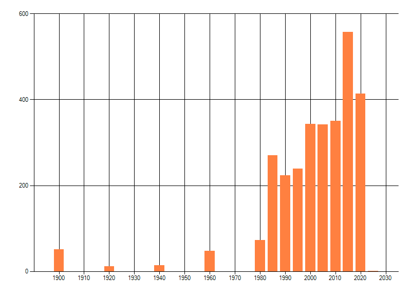 Het aantal atlasblokken (5x5 km) waarin de soort is gemeld binnen een periode van vijf jaar (vanaf 1980) of twintig jaar. Niet gecorrigeerd voor waarnemersinspanning en het aantal doorgegeven waarnemingen kan sterk variëren per periode, dus een trend in verspreiding kan hier niet direct uit worden afgelezen. Het opgegeven jaartal is het eerste jaar van de periode. Bron: gevalideerde waarnemingen uit de NDFF.