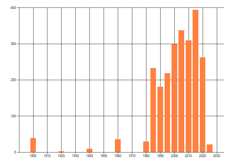 Het aantal atlasblokken (5x5 km) waarin de soort is gemeld binnen een periode van vijf jaar (vanaf 1980) of twintig jaar. Niet gecorrigeerd voor waarnemersinspanning en het aantal doorgegeven waarnemingen kan sterk variëren per periode, dus een trend in verspreiding kan hier niet direct uit worden afgelezen. Het opgegeven jaartal is het eerste jaar van de periode. Bron: gevalideerde waarnemingen uit de NDFF.