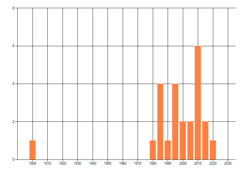 Het aantal atlasblokken (5x5 km) waarin de soort is gemeld binnen een periode van vijf jaar (vanaf 1980) of twintig jaar. Niet gecorrigeerd voor waarnemersinspanning en het aantal doorgegeven waarnemingen kan sterk variëren per periode, dus een trend in verspreiding kan hier niet direct uit worden afgelezen. Het opgegeven jaartal is het eerste jaar van de periode. Bron: gevalideerde waarnemingen uit de NDFF.
