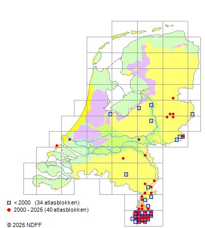 Het aantal atlasblokken (5x5 km) waarin de soort is gemeld binnen een periode van vijf jaar (vanaf 1980) of twintig jaar. Niet gecorrigeerd voor waarnemersinspanning en het aantal doorgegeven waarnemingen kan sterk variëren per periode, dus een trend in verspreiding kan hier niet direct uit worden afgelezen. Het opgegeven jaartal is het eerste jaar van de periode. Bron: gevalideerde waarnemingen uit de NDFF.