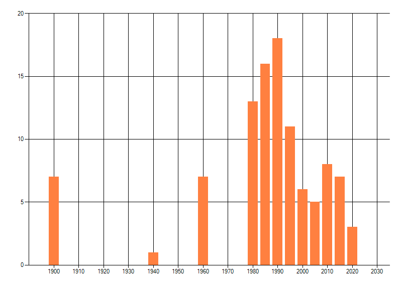 Het aantal atlasblokken (5x5 km) waarin de soort is gemeld binnen een periode van vijf jaar (vanaf 1980) of twintig jaar. Niet gecorrigeerd voor waarnemersinspanning en het aantal doorgegeven waarnemingen kan sterk variëren per periode, dus een trend in verspreiding kan hier niet direct uit worden afgelezen. Het opgegeven jaartal is het eerste jaar van de periode. Bron: gevalideerde waarnemingen uit de NDFF.