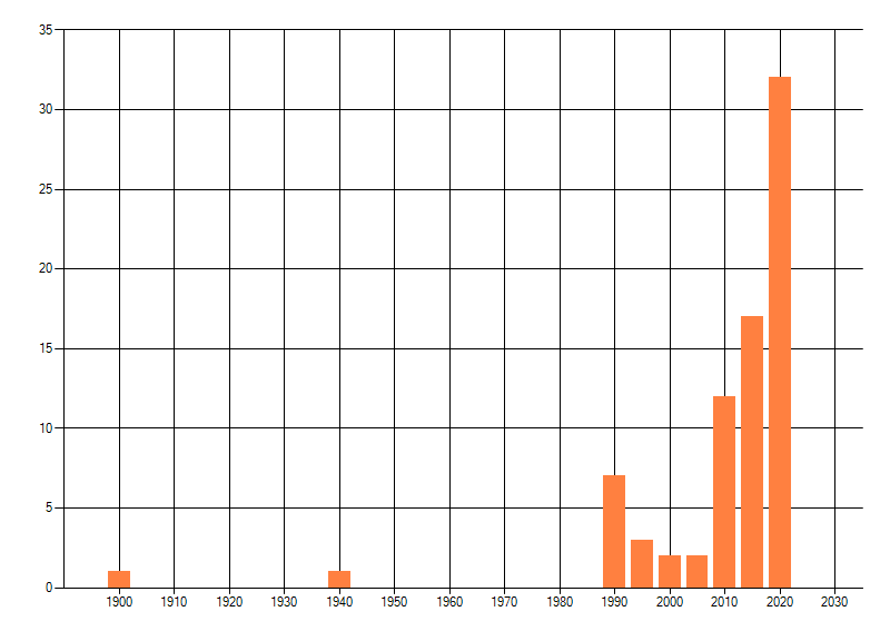 Het aantal atlasblokken (5x5 km) waarin de soort is gemeld binnen een periode van vijf jaar (vanaf 1980) of twintig jaar. Niet gecorrigeerd voor waarnemersinspanning en het aantal doorgegeven waarnemingen kan sterk variëren per periode, dus een trend in verspreiding kan hier niet direct uit worden afgelezen. Het opgegeven jaartal is het eerste jaar van de periode. Bron: gevalideerde waarnemingen uit de NDFF.