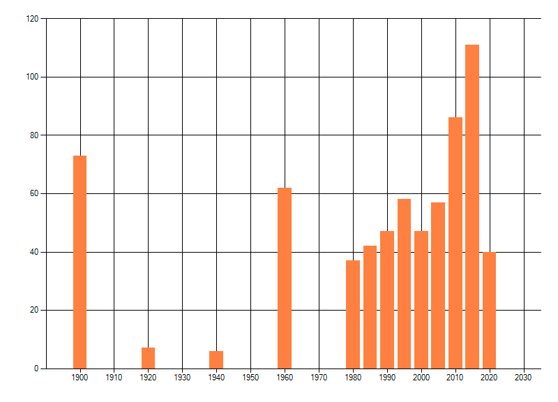 Het aantal atlasblokken (5x5 km) waarin de soort is gemeld binnen een periode van vijf jaar (vanaf 1980) of twintig jaar. Niet gecorrigeerd voor waarnemersinspanning en het aantal doorgegeven waarnemingen kan sterk variëren per periode, dus een trend in verspreiding kan hier niet direct uit worden afgelezen. Het opgegeven jaartal is het eerste jaar van de periode. Bron: gevalideerde waarnemingen uit de NDFF.