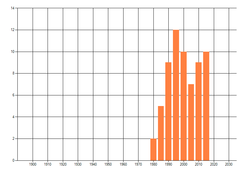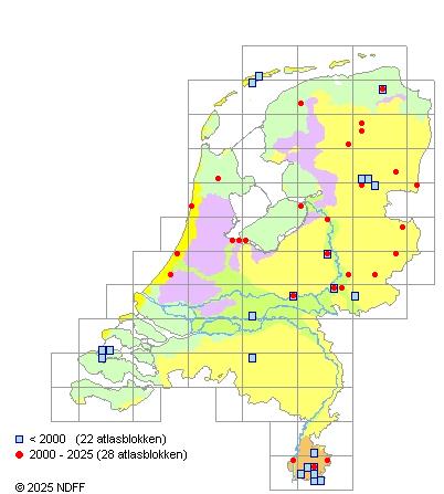 Het aantal atlasblokken (5x5 km) waarin de soort is gemeld binnen een periode van vijf jaar (vanaf 1980) of twintig jaar. Niet gecorrigeerd voor waarnemersinspanning en het aantal doorgegeven waarnemingen kan sterk variëren per periode, dus een trend in verspreiding kan hier niet direct uit worden afgelezen. Het opgegeven jaartal is het eerste jaar van de periode. Bron: gevalideerde waarnemingen uit de NDFF.