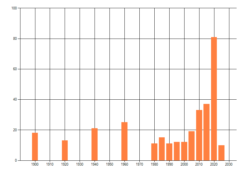Het aantal atlasblokken (5x5 km) waarin de soort is gemeld binnen een periode van vijf jaar (vanaf 1980) of twintig jaar. Niet gecorrigeerd voor waarnemersinspanning en het aantal doorgegeven waarnemingen kan sterk variëren per periode, dus een trend in verspreiding kan hier niet direct uit worden afgelezen. Het opgegeven jaartal is het eerste jaar van de periode. Bron: gevalideerde waarnemingen uit de NDFF.