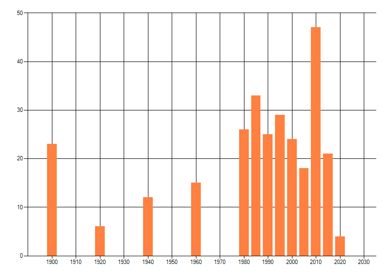 Het aantal atlasblokken (5x5 km) waarin de soort is gemeld binnen een periode van vijf jaar (vanaf 1980) of twintig jaar. Niet gecorrigeerd voor waarnemersinspanning en het aantal doorgegeven waarnemingen kan sterk variëren per periode, dus een trend in verspreiding kan hier niet direct uit worden afgelezen. Het opgegeven jaartal is het eerste jaar van de periode. Bron: gevalideerde waarnemingen uit de NDFF.