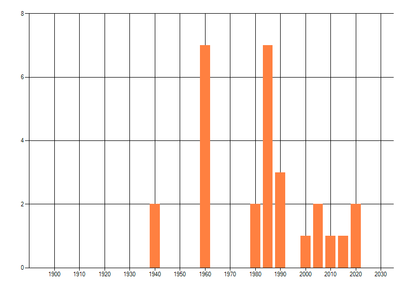 Het aantal atlasblokken (5x5 km) waarin de soort is gemeld binnen een periode van vijf jaar (vanaf 1980) of twintig jaar. Niet gecorrigeerd voor waarnemersinspanning en het aantal doorgegeven waarnemingen kan sterk variëren per periode, dus een trend in verspreiding kan hier niet direct uit worden afgelezen. Het opgegeven jaartal is het eerste jaar van de periode. Bron: gevalideerde waarnemingen uit de NDFF.