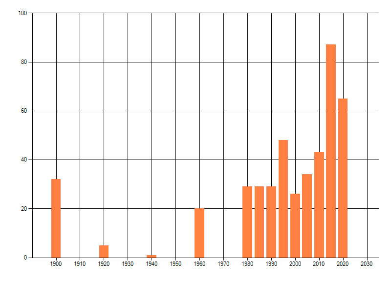 Het aantal atlasblokken (5x5 km) waarin de soort is gemeld binnen een periode van vijf jaar (vanaf 1980) of twintig jaar. Niet gecorrigeerd voor waarnemersinspanning en het aantal doorgegeven waarnemingen kan sterk variëren per periode, dus een trend in verspreiding kan hier niet direct uit worden afgelezen. Het opgegeven jaartal is het eerste jaar van de periode. Bron: gevalideerde waarnemingen uit de NDFF.