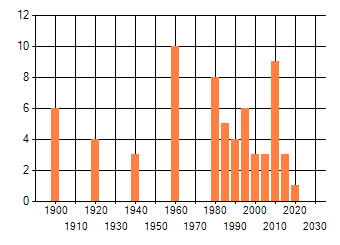 Het aantal atlasblokken (5x5 km) waarin de soort is gemeld binnen een periode van vijf jaar (vanaf 1980) of twintig jaar. Niet gecorrigeerd voor waarnemersinspanning en het aantal doorgegeven waarnemingen kan sterk variëren per periode, dus een trend in verspreiding kan hier niet direct uit worden afgelezen. Het opgegeven jaartal is het eerste jaar van de periode. Bron: gevalideerde waarnemingen uit de NDFF.