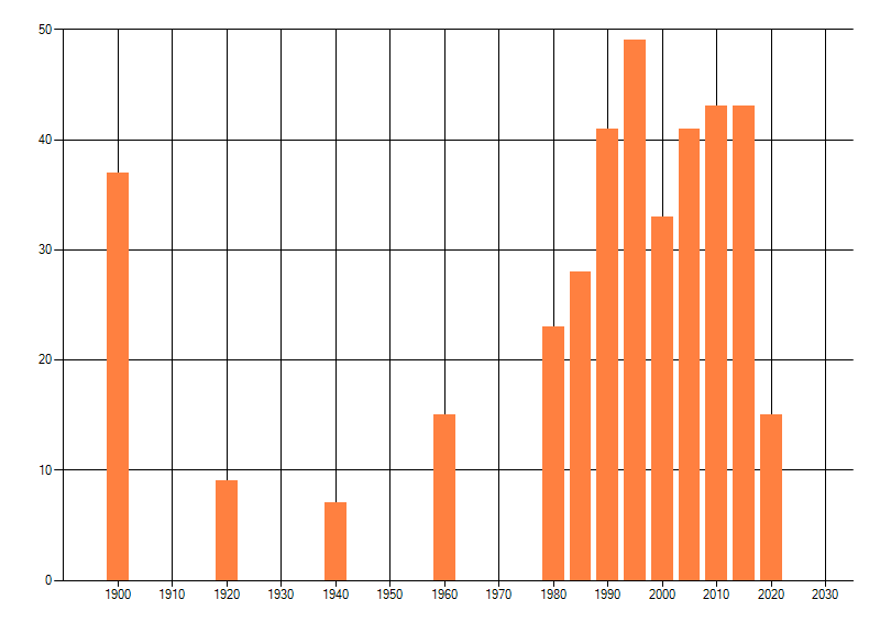 Het aantal atlasblokken (5x5 km) waarin de soort is gemeld binnen een periode van vijf jaar (vanaf 1980) of twintig jaar. Niet gecorrigeerd voor waarnemersinspanning en het aantal doorgegeven waarnemingen kan sterk variëren per periode, dus een trend in verspreiding kan hier niet direct uit worden afgelezen. Het opgegeven jaartal is het eerste jaar van de periode. Bron: gevalideerde waarnemingen uit de NDFF.