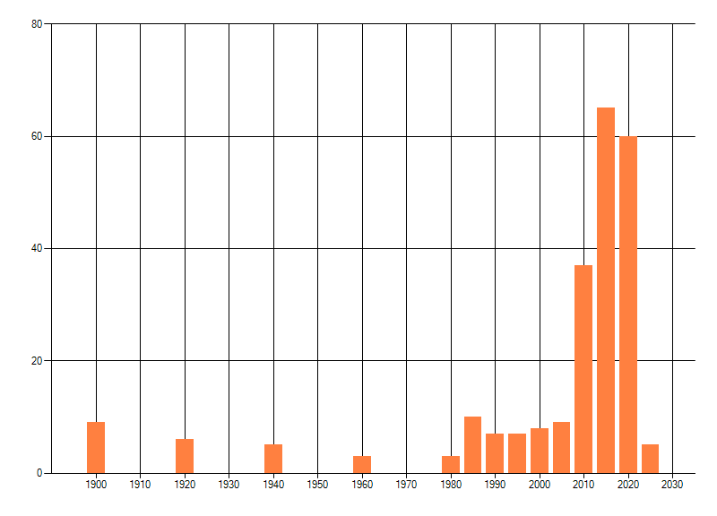 Het aantal atlasblokken (5x5 km) waarin de soort is gemeld binnen een periode van vijf jaar (vanaf 1980) of twintig jaar. Niet gecorrigeerd voor waarnemersinspanning en het aantal doorgegeven waarnemingen kan sterk variëren per periode, dus een trend in verspreiding kan hier niet direct uit worden afgelezen. Het opgegeven jaartal is het eerste jaar van de periode. Bron: gevalideerde waarnemingen uit de NDFF.