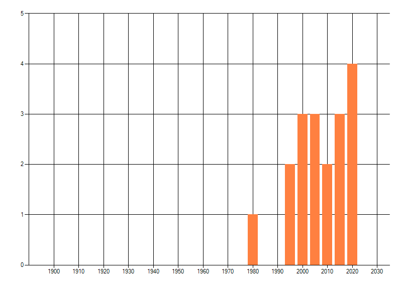 Het aantal atlasblokken (5x5 km) waarin de soort is gemeld binnen een periode van vijf jaar (vanaf 1980) of twintig jaar. Niet gecorrigeerd voor waarnemersinspanning en het aantal doorgegeven waarnemingen kan sterk variëren per periode, dus een trend in verspreiding kan hier niet direct uit worden afgelezen. Het opgegeven jaartal is het eerste jaar van de periode. Bron: gevalideerde waarnemingen uit de NDFF.