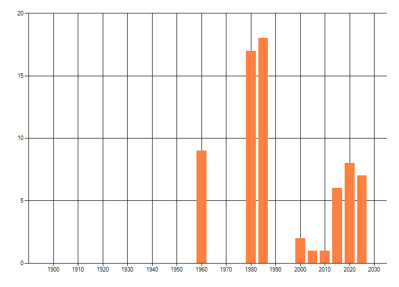 Het aantal atlasblokken (5x5 km) waarin de soort is gemeld binnen een periode van vijf jaar (vanaf 1980) of twintig jaar. Niet gecorrigeerd voor waarnemersinspanning en het aantal doorgegeven waarnemingen kan sterk variëren per periode, dus een trend in verspreiding kan hier niet direct uit worden afgelezen. Het opgegeven jaartal is het eerste jaar van de periode. Bron: gevalideerde waarnemingen uit de NDFF.