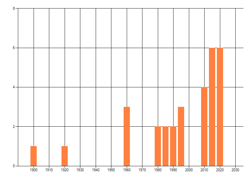 Het aantal atlasblokken (5x5 km) waarin de soort is gemeld binnen een periode van vijf jaar (vanaf 1980) of twintig jaar. Niet gecorrigeerd voor waarnemersinspanning en het aantal doorgegeven waarnemingen kan sterk variëren per periode, dus een trend in verspreiding kan hier niet direct uit worden afgelezen. Het opgegeven jaartal is het eerste jaar van de periode. Bron: gevalideerde waarnemingen uit de NDFF.