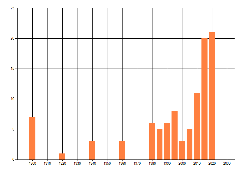 Het aantal atlasblokken (5x5 km) waarin de soort is gemeld binnen een periode van vijf jaar (vanaf 1980) of twintig jaar. Niet gecorrigeerd voor waarnemersinspanning en het aantal doorgegeven waarnemingen kan sterk variëren per periode, dus een trend in verspreiding kan hier niet direct uit worden afgelezen. Het opgegeven jaartal is het eerste jaar van de periode. Bron: gevalideerde waarnemingen uit de NDFF.