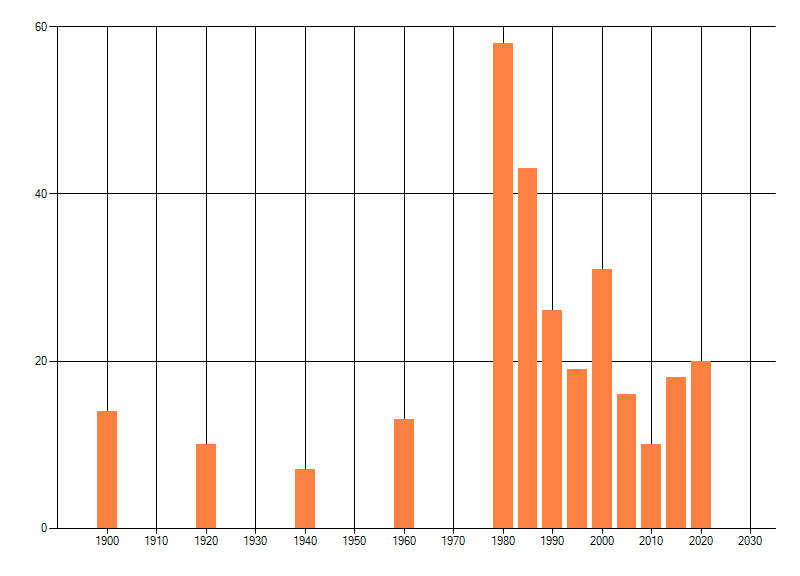 Het aantal atlasblokken (5x5 km) waarin de soort is gemeld binnen een periode van vijf jaar (vanaf 1980) of twintig jaar. Niet gecorrigeerd voor waarnemersinspanning en het aantal doorgegeven waarnemingen kan sterk variëren per periode, dus een trend in verspreiding kan hier niet direct uit worden afgelezen. Het opgegeven jaartal is het eerste jaar van de periode. Bron: gevalideerde waarnemingen uit de NDFF.