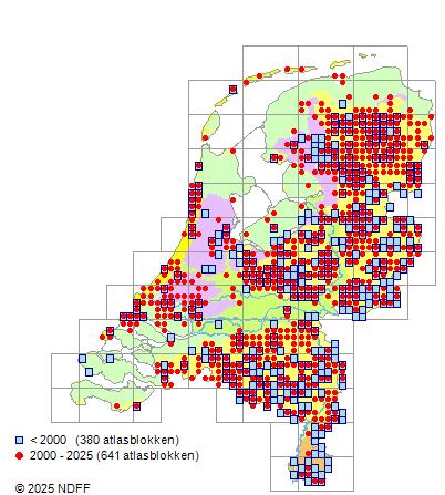 Het aantal atlasblokken (5x5 km) waarin de soort is gemeld binnen een periode van vijf jaar (vanaf 1980) of twintig jaar. Niet gecorrigeerd voor waarnemersinspanning en het aantal doorgegeven waarnemingen kan sterk variëren per periode, dus een trend in verspreiding kan hier niet direct uit worden afgelezen. Het opgegeven jaartal is het eerste jaar van de periode. Bron: gevalideerde waarnemingen uit de NDFF.