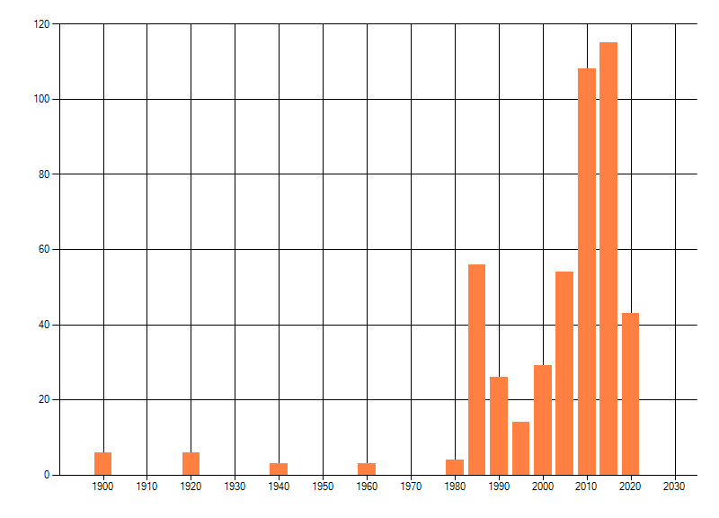 Het aantal atlasblokken (5x5 km) waarin de soort is gemeld binnen een periode van vijf jaar (vanaf 1980) of twintig jaar. Niet gecorrigeerd voor waarnemersinspanning en het aantal doorgegeven waarnemingen kan sterk variëren per periode, dus een trend in verspreiding kan hier niet direct uit worden afgelezen. Het opgegeven jaartal is het eerste jaar van de periode. Bron: gevalideerde waarnemingen uit de NDFF.
