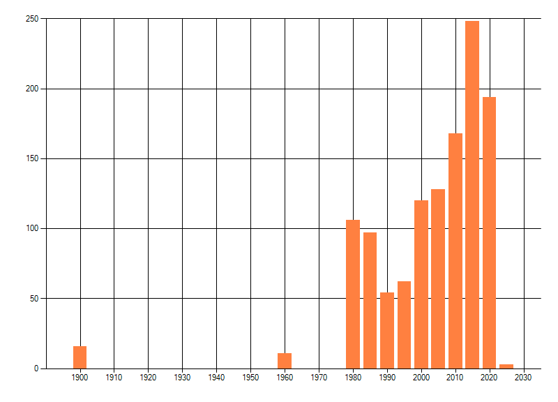 Het aantal atlasblokken (5x5 km) waarin de soort is gemeld binnen een periode van vijf jaar (vanaf 1980) of twintig jaar. Niet gecorrigeerd voor waarnemersinspanning en het aantal doorgegeven waarnemingen kan sterk variëren per periode, dus een trend in verspreiding kan hier niet direct uit worden afgelezen. Het opgegeven jaartal is het eerste jaar van de periode. Bron: gevalideerde waarnemingen uit de NDFF.