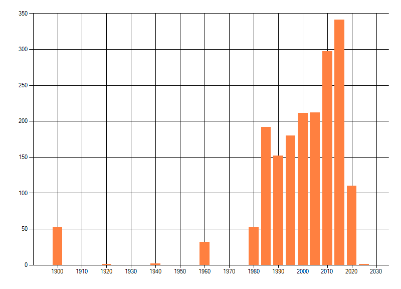 Het aantal atlasblokken (5x5 km) waarin de soort is gemeld binnen een periode van vijf jaar (vanaf 1980) of twintig jaar. Niet gecorrigeerd voor waarnemersinspanning en het aantal doorgegeven waarnemingen kan sterk variëren per periode, dus een trend in verspreiding kan hier niet direct uit worden afgelezen. Het opgegeven jaartal is het eerste jaar van de periode. Bron: gevalideerde waarnemingen uit de NDFF.