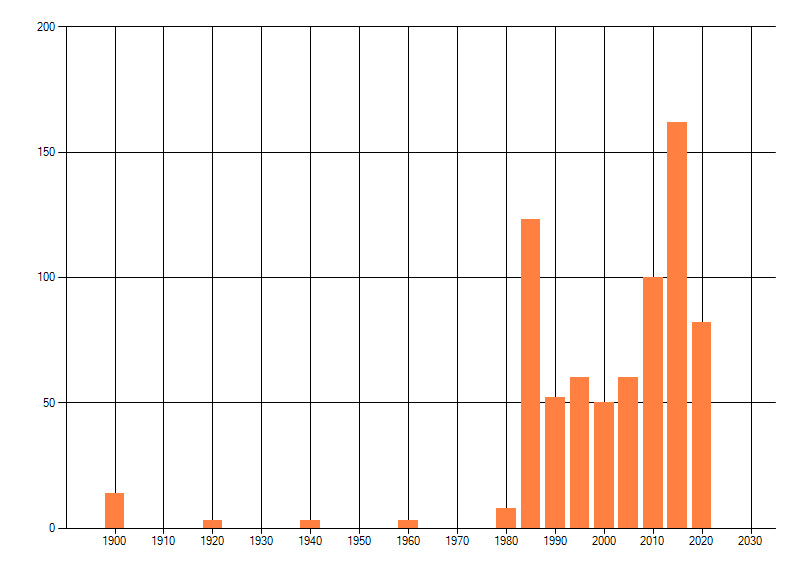 Het aantal atlasblokken (5x5 km) waarin de soort is gemeld binnen een periode van vijf jaar (vanaf 1980) of twintig jaar. Niet gecorrigeerd voor waarnemersinspanning en het aantal doorgegeven waarnemingen kan sterk variëren per periode, dus een trend in verspreiding kan hier niet direct uit worden afgelezen. Het opgegeven jaartal is het eerste jaar van de periode. Bron: gevalideerde waarnemingen uit de NDFF.