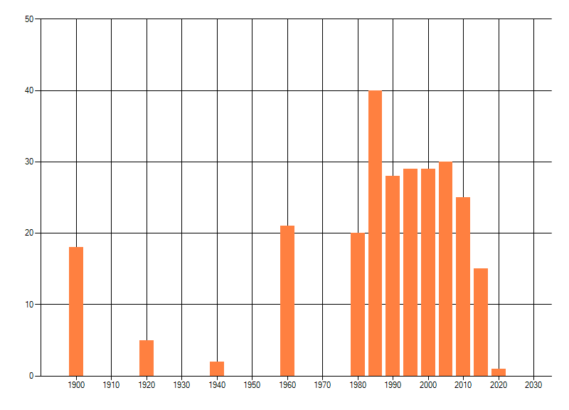 Het aantal atlasblokken (5x5 km) waarin de soort is gemeld binnen een periode van vijf jaar (vanaf 1980) of twintig jaar. Niet gecorrigeerd voor waarnemersinspanning en het aantal doorgegeven waarnemingen kan sterk variëren per periode, dus een trend in verspreiding kan hier niet direct uit worden afgelezen. Het opgegeven jaartal is het eerste jaar van de periode. Bron: gevalideerde waarnemingen uit de NDFF.