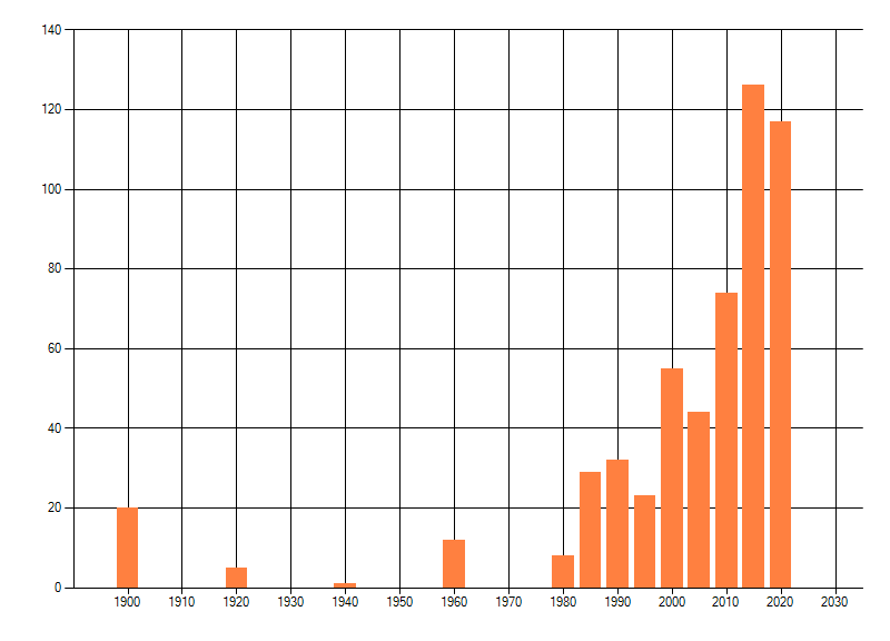 Het aantal atlasblokken (5x5 km) waarin de soort is gemeld binnen een periode van vijf jaar (vanaf 1980) of twintig jaar. Niet gecorrigeerd voor waarnemersinspanning en het aantal doorgegeven waarnemingen kan sterk variëren per periode, dus een trend in verspreiding kan hier niet direct uit worden afgelezen. Het opgegeven jaartal is het eerste jaar van de periode. Bron: gevalideerde waarnemingen uit de NDFF.