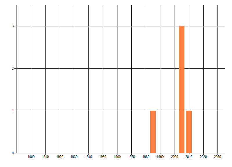 Het aantal atlasblokken (5x5 km) waarin de soort is gemeld binnen een periode van vijf jaar (vanaf 1980) of twintig jaar. Niet gecorrigeerd voor waarnemersinspanning en het aantal doorgegeven waarnemingen kan sterk variëren per periode, dus een trend in verspreiding kan hier niet direct uit worden afgelezen. Het opgegeven jaartal is het eerste jaar van de periode. Bron: gevalideerde waarnemingen uit de NDFF.