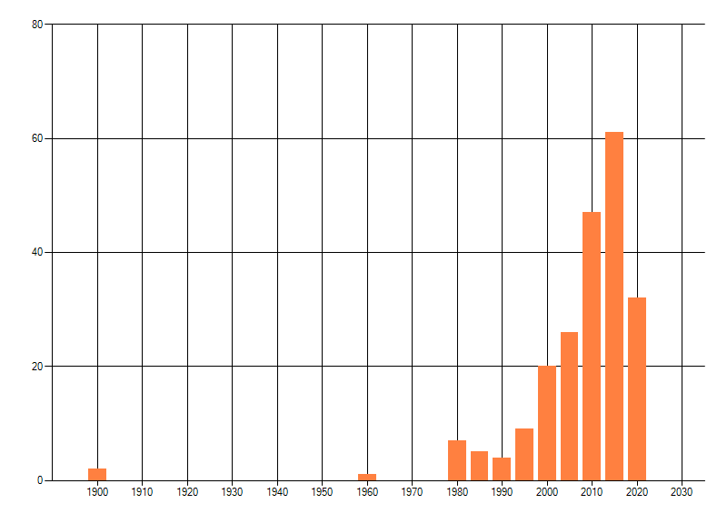 Het aantal atlasblokken (5x5 km) waarin de soort is gemeld binnen een periode van vijf jaar (vanaf 1980) of twintig jaar. Niet gecorrigeerd voor waarnemersinspanning en het aantal doorgegeven waarnemingen kan sterk variëren per periode, dus een trend in verspreiding kan hier niet direct uit worden afgelezen. Het opgegeven jaartal is het eerste jaar van de periode. Bron: gevalideerde waarnemingen uit de NDFF.