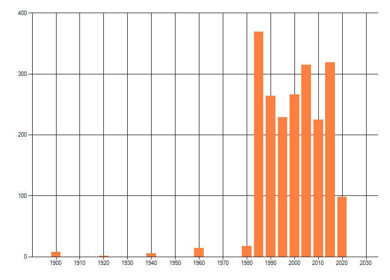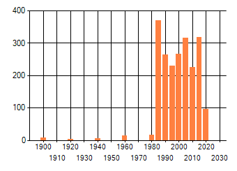 Het aantal atlasblokken (5x5 km) waarin de soort is gemeld binnen een periode van vijf jaar (vanaf 1980) of twintig jaar. Niet gecorrigeerd voor waarnemersinspanning en het aantal doorgegeven waarnemingen kan sterk variëren per periode, dus een trend in verspreiding kan hier niet direct uit worden afgelezen. Het opgegeven jaartal is het eerste jaar van de periode. Bron: gevalideerde waarnemingen uit de NDFF.