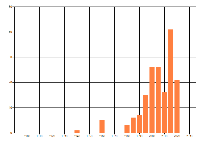 Het aantal atlasblokken (5x5 km) waarin de soort is gemeld binnen een periode van vijf jaar (vanaf 1980) of twintig jaar. Niet gecorrigeerd voor waarnemersinspanning en het aantal doorgegeven waarnemingen kan sterk variëren per periode, dus een trend in verspreiding kan hier niet direct uit worden afgelezen. Het opgegeven jaartal is het eerste jaar van de periode. Bron: gevalideerde waarnemingen uit de NDFF.