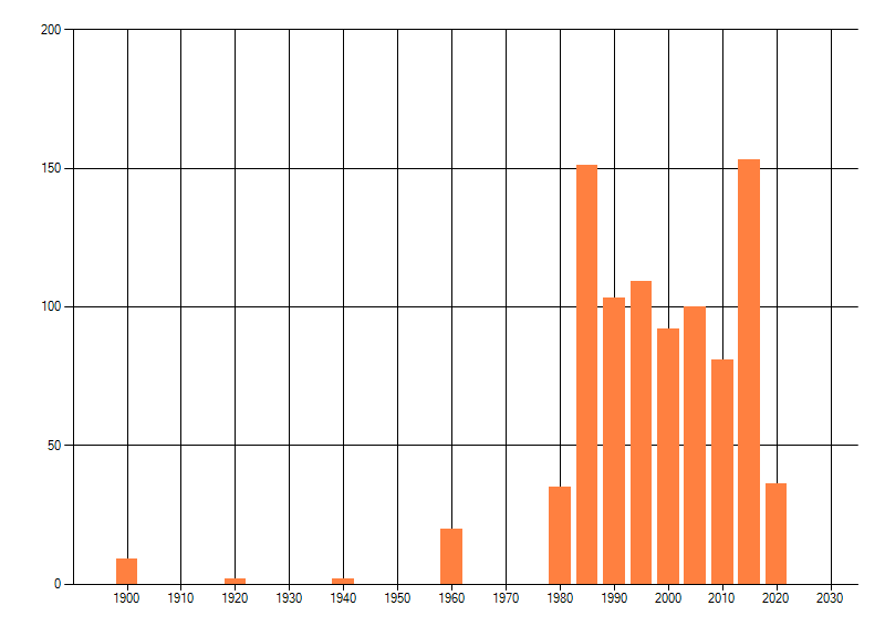 Het aantal atlasblokken (5x5 km) waarin de soort is gemeld binnen een periode van vijf jaar (vanaf 1980) of twintig jaar. Niet gecorrigeerd voor waarnemersinspanning en het aantal doorgegeven waarnemingen kan sterk variëren per periode, dus een trend in verspreiding kan hier niet direct uit worden afgelezen. Het opgegeven jaartal is het eerste jaar van de periode. Bron: gevalideerde waarnemingen uit de NDFF.