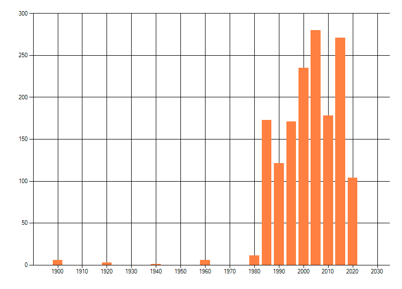 Het aantal atlasblokken (5x5 km) waarin de soort is gemeld binnen een periode van vijf jaar (vanaf 1980) of twintig jaar. Niet gecorrigeerd voor waarnemersinspanning en het aantal doorgegeven waarnemingen kan sterk variëren per periode, dus een trend in verspreiding kan hier niet direct uit worden afgelezen. Het opgegeven jaartal is het eerste jaar van de periode. Bron: gevalideerde waarnemingen uit de NDFF.