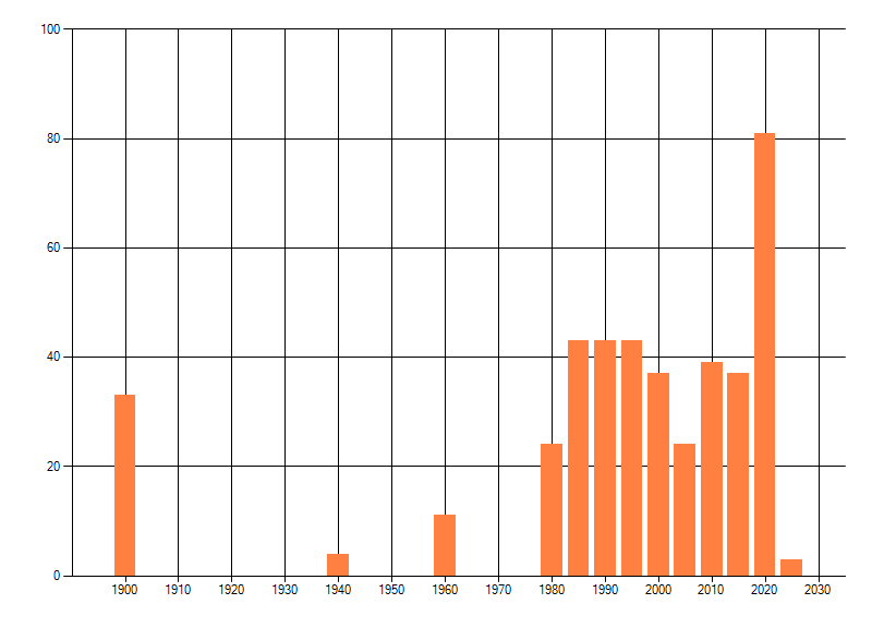 Het aantal atlasblokken (5x5 km) waarin de soort is gemeld binnen een periode van vijf jaar (vanaf 1980) of twintig jaar. Niet gecorrigeerd voor waarnemersinspanning en het aantal doorgegeven waarnemingen kan sterk variëren per periode, dus een trend in verspreiding kan hier niet direct uit worden afgelezen. Het opgegeven jaartal is het eerste jaar van de periode. Bron: gevalideerde waarnemingen uit de NDFF.