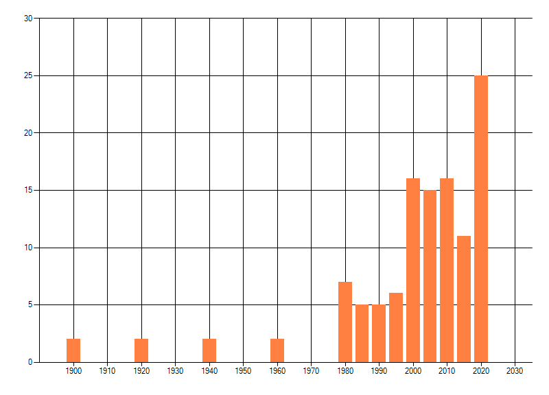 Het aantal atlasblokken (5x5 km) waarin de soort is gemeld binnen een periode van vijf jaar (vanaf 1980) of twintig jaar. Niet gecorrigeerd voor waarnemersinspanning en het aantal doorgegeven waarnemingen kan sterk variëren per periode, dus een trend in verspreiding kan hier niet direct uit worden afgelezen. Het opgegeven jaartal is het eerste jaar van de periode. Bron: gevalideerde waarnemingen uit de NDFF.