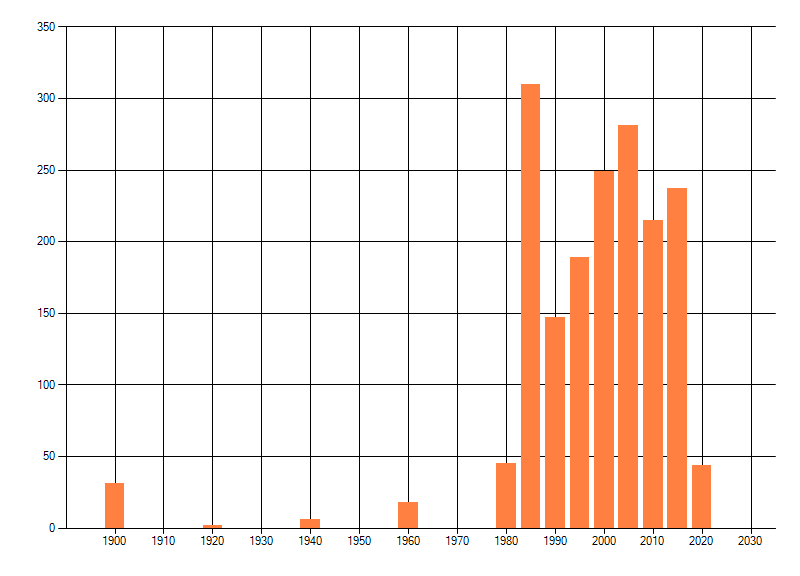 Het aantal atlasblokken (5x5 km) waarin de soort is gemeld binnen een periode van vijf jaar (vanaf 1980) of twintig jaar. Niet gecorrigeerd voor waarnemersinspanning en het aantal doorgegeven waarnemingen kan sterk variëren per periode, dus een trend in verspreiding kan hier niet direct uit worden afgelezen. Het opgegeven jaartal is het eerste jaar van de periode. Bron: gevalideerde waarnemingen uit de NDFF.