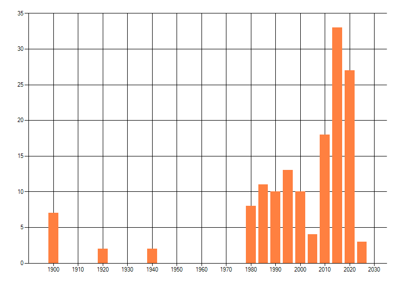 Het aantal atlasblokken (5x5 km) waarin de soort is gemeld binnen een periode van vijf jaar (vanaf 1980) of twintig jaar. Niet gecorrigeerd voor waarnemersinspanning en het aantal doorgegeven waarnemingen kan sterk variëren per periode, dus een trend in verspreiding kan hier niet direct uit worden afgelezen. Het opgegeven jaartal is het eerste jaar van de periode. Bron: gevalideerde waarnemingen uit de NDFF.