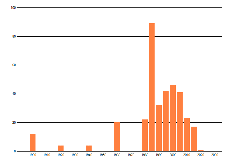 Het aantal atlasblokken (5x5 km) waarin de soort is gemeld binnen een periode van vijf jaar (vanaf 1980) of twintig jaar. Niet gecorrigeerd voor waarnemersinspanning en het aantal doorgegeven waarnemingen kan sterk variëren per periode, dus een trend in verspreiding kan hier niet direct uit worden afgelezen. Het opgegeven jaartal is het eerste jaar van de periode. Bron: gevalideerde waarnemingen uit de NDFF.