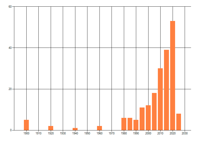 Het aantal atlasblokken (5x5 km) waarin de soort is gemeld binnen een periode van vijf jaar (vanaf 1980) of twintig jaar. Niet gecorrigeerd voor waarnemersinspanning en het aantal doorgegeven waarnemingen kan sterk variëren per periode, dus een trend in verspreiding kan hier niet direct uit worden afgelezen. Het opgegeven jaartal is het eerste jaar van de periode. Bron: gevalideerde waarnemingen uit de NDFF.
