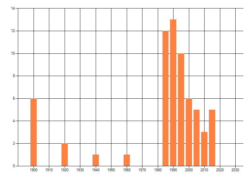 Het aantal atlasblokken (5x5 km) waarin de soort is gemeld binnen een periode van vijf jaar (vanaf 1980) of twintig jaar. Niet gecorrigeerd voor waarnemersinspanning en het aantal doorgegeven waarnemingen kan sterk variëren per periode, dus een trend in verspreiding kan hier niet direct uit worden afgelezen. Het opgegeven jaartal is het eerste jaar van de periode. Bron: gevalideerde waarnemingen uit de NDFF.