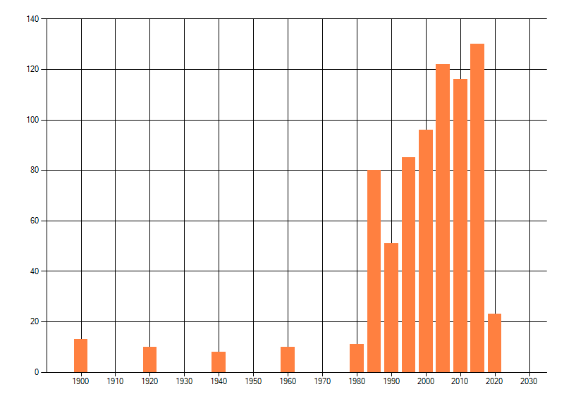 Het aantal atlasblokken (5x5 km) waarin de soort is gemeld binnen een periode van vijf jaar (vanaf 1980) of twintig jaar. Niet gecorrigeerd voor waarnemersinspanning en het aantal doorgegeven waarnemingen kan sterk variëren per periode, dus een trend in verspreiding kan hier niet direct uit worden afgelezen. Het opgegeven jaartal is het eerste jaar van de periode. Bron: gevalideerde waarnemingen uit de NDFF.